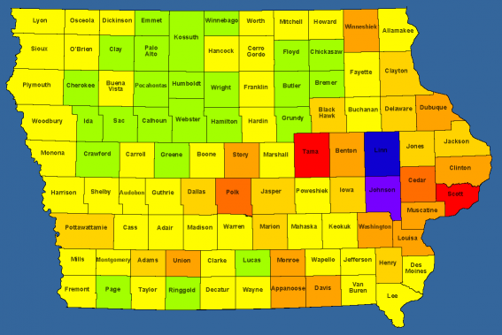 | Most Counties in a day: | 13 (Grundy : Iowa, Hardin : Iowa, Hamilton : Iowa, Marion : Iowa, Webster : Iowa, Humboldt : Iowa, Warren : Iowa, Kossuth : Iowa, Palo Alto : Iowa, Emmet : Iowa, Clay : Iowa, O'Brien : Iowa, Dickinson : Iowa) on 8/13/2017 |