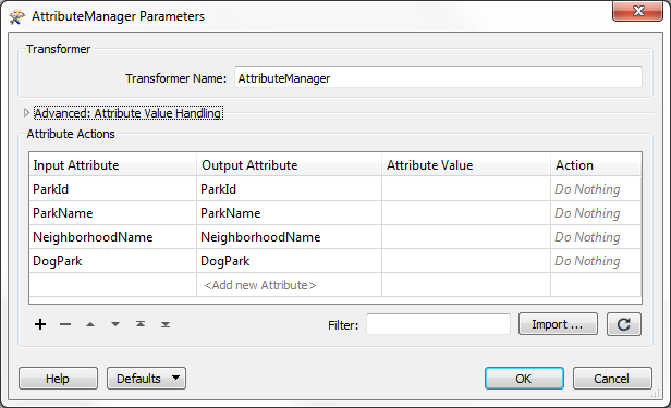 The AttributeManager parameters dialog has a number of fields: Input Attribute, Output Attribute, Attribute Value, and Action. Uniquely among attribute-handling transformers, it is automatically filled in with the details of the attributes connected to it:
