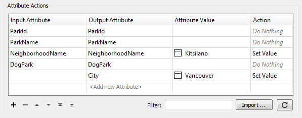 However, also note that the existing attribute NeighborhoodName is also being assigned a fixed value. It is being given the value "Kitsilano". Notice how by entering a value into that field, the Action field has automatically changed from "Do Nothing" to "Set Value".