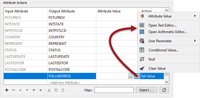 This capability is very useful because an attribute is no longer a fixed value: it can be constructed from a mix of existing attributes and parameters. The two methods are the Text Editor and Arithmetic Editor.