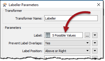 Just like attribute construction, conditional values apply not only to attributes but to most FME parameters; for example, I can create labels conditional upon certain tests using the Labeller transformer itself: