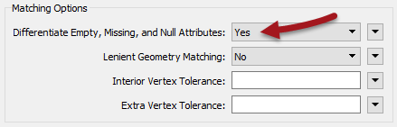 If set to Yes, then two features can only match when their attributes are the same type of nothing; i.e., when <null> one on feature is matched by <null> on the other.