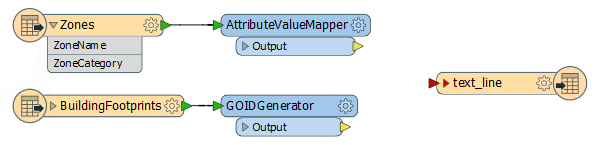 You may want to rerun the workspace and inspect the SpatialFilter caches to ensure that the building features do - as expected - emerge from the SpatialFilter:Passed output port and possess three new attributes (ZoneName, ZoneCategory, and TaxMultiplier).
