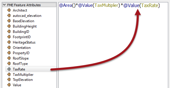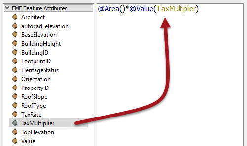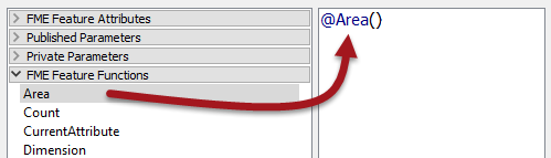 So, start out by locating Area under FME Feature Functions and double-clicking it to add the area of the building footprint to the equation: