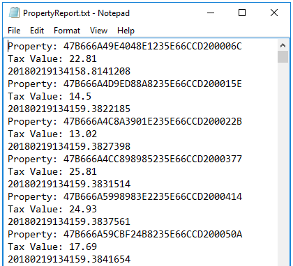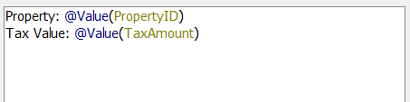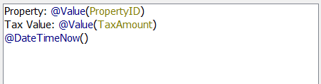 Property: <PropertyID> Tax Value: <TaxValue> <Current Date and Time>