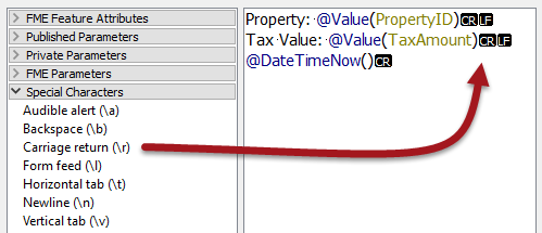 Then locate Carriage Return (\r) in the Special Characters menu and add one for each line: