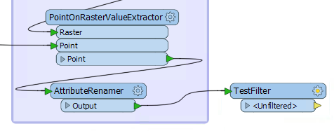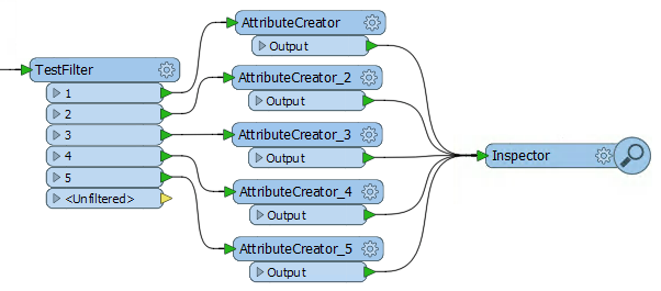 To do so, add an AttributeCreator (or AttributeManager) connected to each TestFilter output port. Use the AttributeCreator to create the correct FloodRisk attribute (and value) for each output port (i.e. Port 1: FloodRisk = 1):
