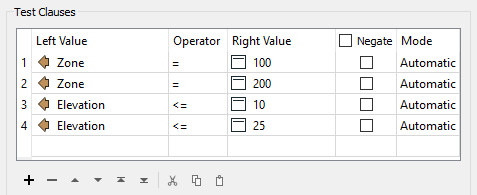 So, enter four clauses; one each for Zone=100, Zone=200, Elevation<=10, Elevation<=25. You can use the Copy and Paste buttons or the keyboard shortcuts in this dialog to help speed up the process.