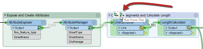 Run From This causes the workspace to run from that point only, using data cached up until that point. Notice how hovering over the option causes all "downstream" transformers to be highlighted. They are the only ones that will be run. That makes the translation quicker. The other option is Run To This. The author could use that option on the writer feature type and get much the same effect:
