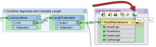 Notice that the caches change color (to yellow) on the LineCombiner and subsequent transformers. This denotes that caches are stale; their data contents no longer match what the workspace would produce. To get the new results, the author must re-run the workspace. However, they do not have to re-run the entire workspace; they can simply start the workspace at the point of change - the LineCombiner: