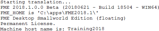 For example, here you can see which version of FME is being used (FME2018.1 beta, 64-bit), its license type (floating), and the machine name (Training2018). If you do have multiple FME versions installed, here’s where you can check to ensure the correct one is running.