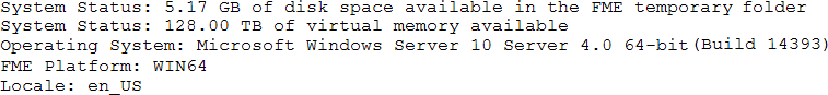 Further on we can see that the system has 5.17 GB of free space in the FME temporary folder and 128 TB of virtual memory. We can also see what operating system we are running FME on (Windows Server 10) and what the current language and encoding settings are: