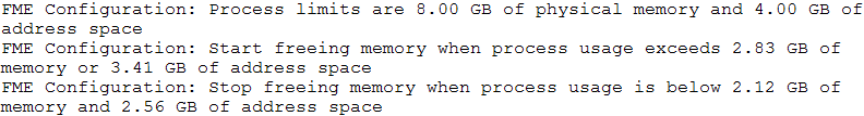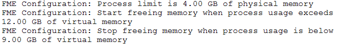 In this case, there is a limit of 4GB memory per process. The following numbers indicate how FME will manage memory resources. It will use 12GB of virtual memory and then it will start to release memory by caching features to disk. This caching will stop once virtual memory use is less than 9GB.