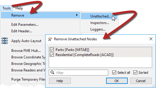 When developing a workspace, it is easy to lose Feature Types that are unused, especially once the workspace grows in size. To quickly remove these unused Feature Types go to Tools > Remove... > Remove Unattached in the menu bar.