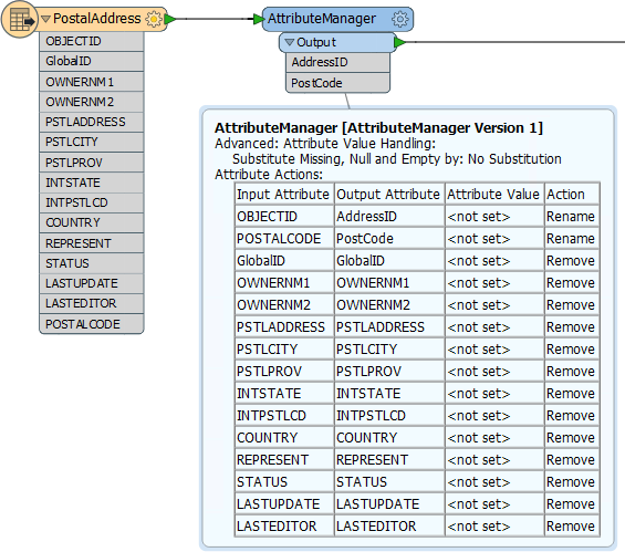 With that, you can ensure that only attributes exposed are read. The other way to remove attributes is by using a transformer (AttributeManager, AttributeRemover, or AttributeKeeper) directly after the source feature type: