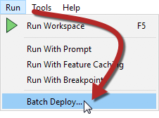 Batch deploy is available under the Run menu in FME Workbench. It supports both instant batch processing and the creation of batch files. This allows you to process a large number of source datasets in the current workspace and produce a separate output for each: