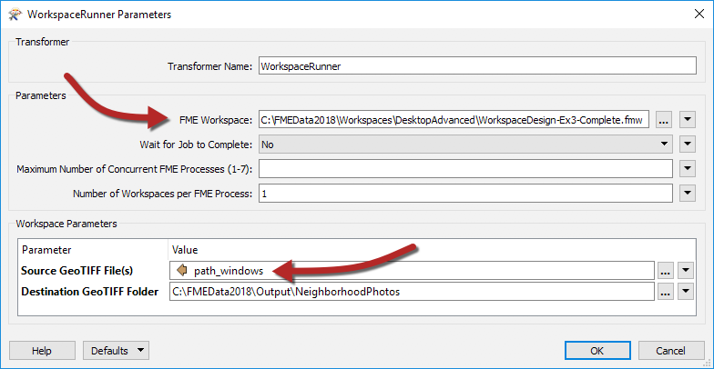 To set up the WorkspaceRunner in a workspace (the Parent), the FME Workspace parameter is pointed to the workspace to be batch processed (the Worker or Helper). The Source File parameter is set to path_windows, an attribute created by the Directory and File Pathnames Reader: