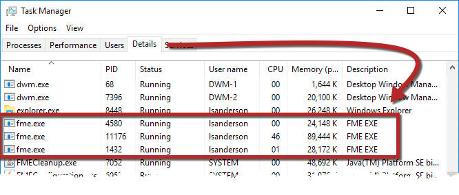 If the job order is unimportant, the parameter Maximum Number of Concurrent FME Processes can be set. This causes multiple FME processes (up to a maximum of seven) to be launched, and these can be seen in the Details tab of Windows Task Manager: