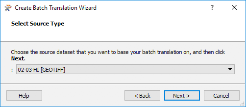 Using the same workspace as above in the Create Batch Translation Wizard, setting the Source Type to the GeoTiff Reader: