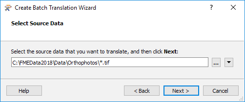 Then select your Source Data. You can select all of the data you want to be batch processed manually or you can use a * wildcard, which will find all of the files ending in .tif: