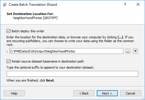 Batch deploy operates in the form of a Wizard. The user specifies the input and output datasets plus any other relevant settings such as a suffix for the output file names.