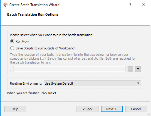 If the process is not carried out right away, a batch .tcl file is created containing the batch process settings, as well as a .bat file which is used to start the process at a later date.