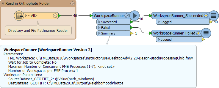 Imagine we get new orthophotos each week. Instead of changing the data in the previous workspace each time, we create a workspace to batch process all the new files. This allows FME to start multiple processes simultaneously so that the data is processed faster: