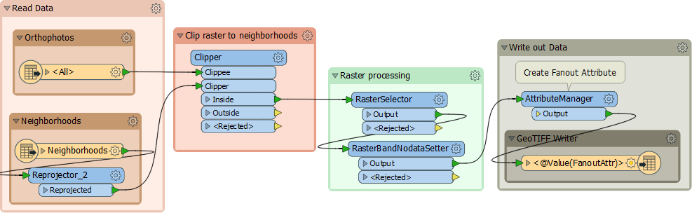 For example, we have a workspace that reads in orthophoto tiles and clips them to neighborhood boundaries, writing them using a combination of tile and neighborhood as the output filename: