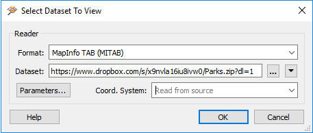 The URL entered into a source dataset field may also be a reference to a shared resource on a web-based file storage system. For example, here a user is reading a MapInfo TAB dataset directly from a Dropbox link into the FME Data Inspector: