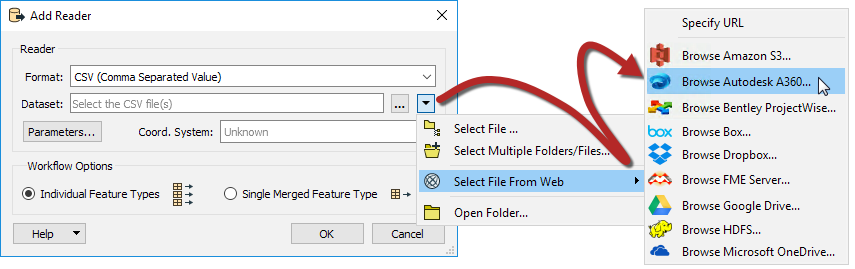 Note that if you wish to use a FeatureReader transformer instead of a reader, then the same "Select File From Web" option is available.