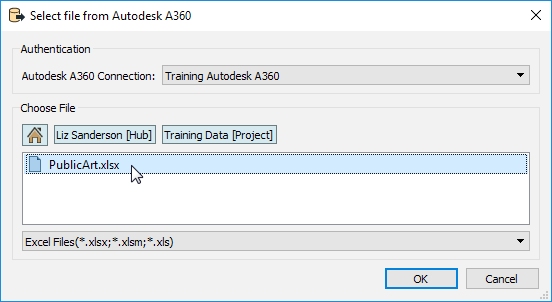 In the above screenshot, an author is adding an Excel dataset from AutoCAD A360. This action opens a dialog in which they can browse AutoCAD A360 for the required file: