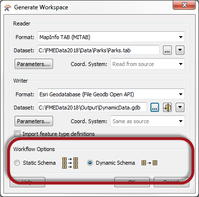 The Static Schema option is the default for a workspace including schema. Choosing the Dynamic Schema option creates a schema-less workspace with dynamic readers and writers.