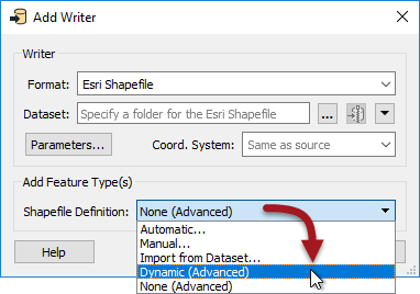 The Add Writer dialog has options for how feature types and their attributes are defined. The most commonly used ones are Manual and Automatic. There is also an option that adds a writer in dynamic mode: