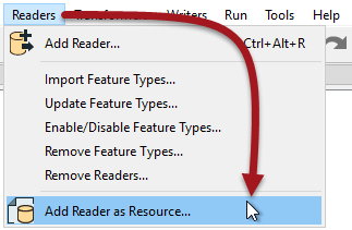 A Resource Reader is a reader that returns the schema of a dataset, but no data. One is added using Readers > Add Reader as Resource on the menubar: