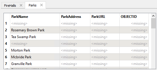 Inspect the output. There should be two layers: one for fire halls, the other for parks. The parks dataset should have the schema from the Geodatabase (not the MapInfo parks), including attributes for ParkName, ParkAddress, and ParkURL (even if there is no data to fill some fields yet):