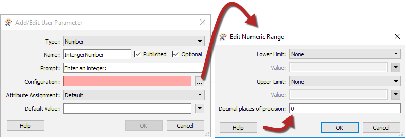 Here, for example, the workspace author is creating an integer parameter. The number of decimal places is set to zero: