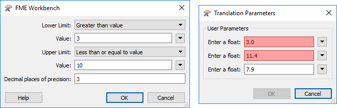 The Upper/Lower Limit settings for a numeric parameter also allow FME to parse the input to ensure it matches what is required: