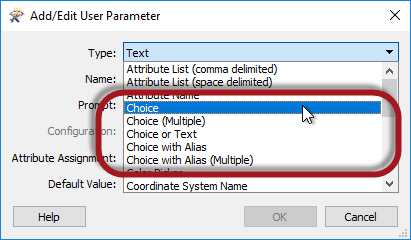 A Choice with Alias parameter is the same as a Choice parameter in that the end-user gets to pick a value from a list. However, a lookup table maps the chosen entry to a value that gets provided to FME.