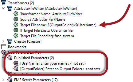 The technique is called embedding because the user parameters - UserName and OutputFolder - are embedded inside the FME parameter (Target Filename).