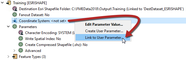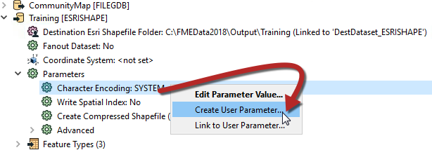 Locate the Shape writer in the Navigator window and expand the list of FME parameters. Identify the Character Encoding parameter, right-click on it and choose Create User Parameter: