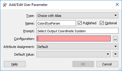 Now create a new user parameter (Right-click User Parameters > Create User Parameter), and set the Type to be Choice with Alias. Set the Name to be CoordSysParam, and set the prompt to be Select Output Coordinate System: