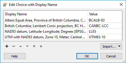 Now click the [...] button to the right of the Configuration setting. This opens a dialog in which to configure the parameter. Normally we would enter values manually in a Choice with Alias parameter, but for coordinate systems (and reader/writer formats) we have the option to have FME define them for us.