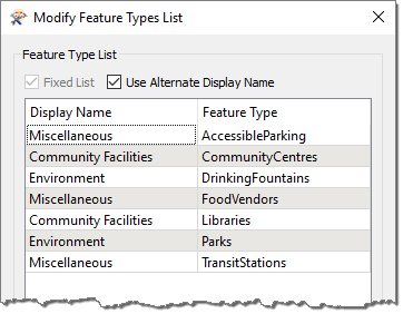 Check the box that is labeled Use Alternate Display Name. This provides the ability to give alternative names for each feature type. What we need to do is use this dialog to group common reader feature types together under a single display name.
