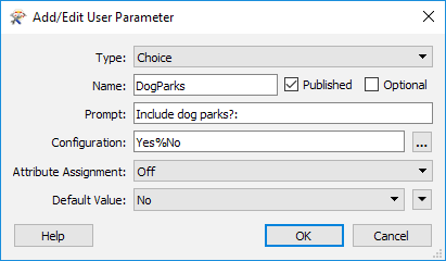 Set it up to be a simple Yes/No question of whether to include dog parks in the output. Turn off Attribute Assignment because - again - we don't want the user to be able to select an attribute.
