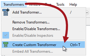 Custom transformers are created by either selecting Create Custom Transformer from the canvas context (right-click) menu or by selecting Transformers > Create Custom Transformer from the menubar. The shortcut key for this function is Ctrl+T.
