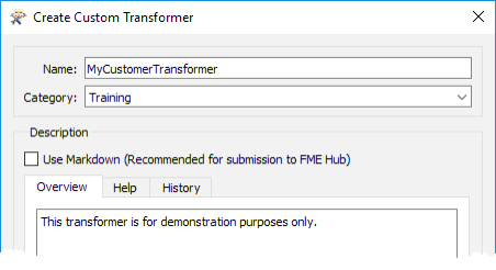 All Custom Transformers require a name and (optionally) a category and description. A dialog in which to define these automatically appears when you create a new custom transformer.