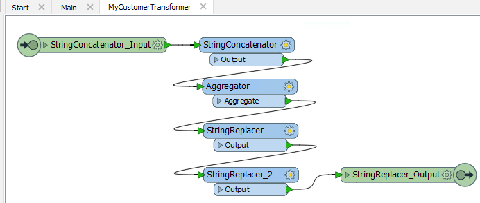When you click on the Main tab, to return to the main canvas view, the original transformers have now been replaced by a custom transformer object that is automatically connected to the existing workspace: