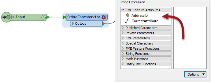 Now PostalCode becomes available to the StringConcatenator and, additionally, made into a user parameter so that back on the main canvas the custom transformer can accept a different attribute selection should PostalCode not be available.