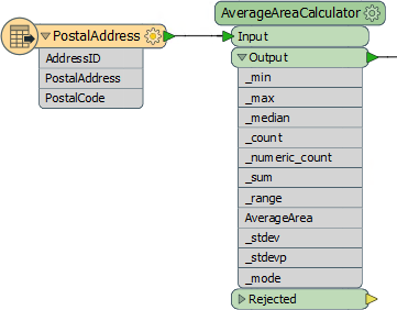 Here a custom transformer is calculating the average area of a number of polygon features. It has renamed ports and a specific output port to deal with bad features, but it is outputting more attributes than are useful: