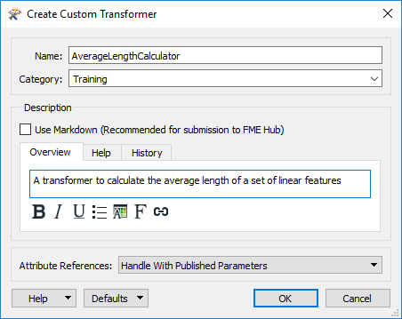 Select the two newly placed transformers and turn them into a Custom Transformer called AverageLengthCalculator. Make sure the attribute references are handled automatically, although at the moment there aren’t any references to handle.